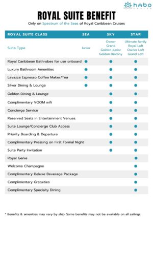 ผู้โดยสารที่พักในห้องสวีทจะได้รับการดูแลพิเศษจาก Royal Suite Class program เป็นโปรแกรมที่ทางเรือสำราญ Royal Caribbean มอบให้สำหรับผู้โดยสารที่พักห้องสวีทเท่านั้น ซึ่งตัว Royal Suite Class program จะแบ่งออกเป็น 3 ระดับ คือ Star Sky และ Sea ในแต่ละระดับก็จะมีความพิเศษมากน้อยที่แตกต่างกันออกไป